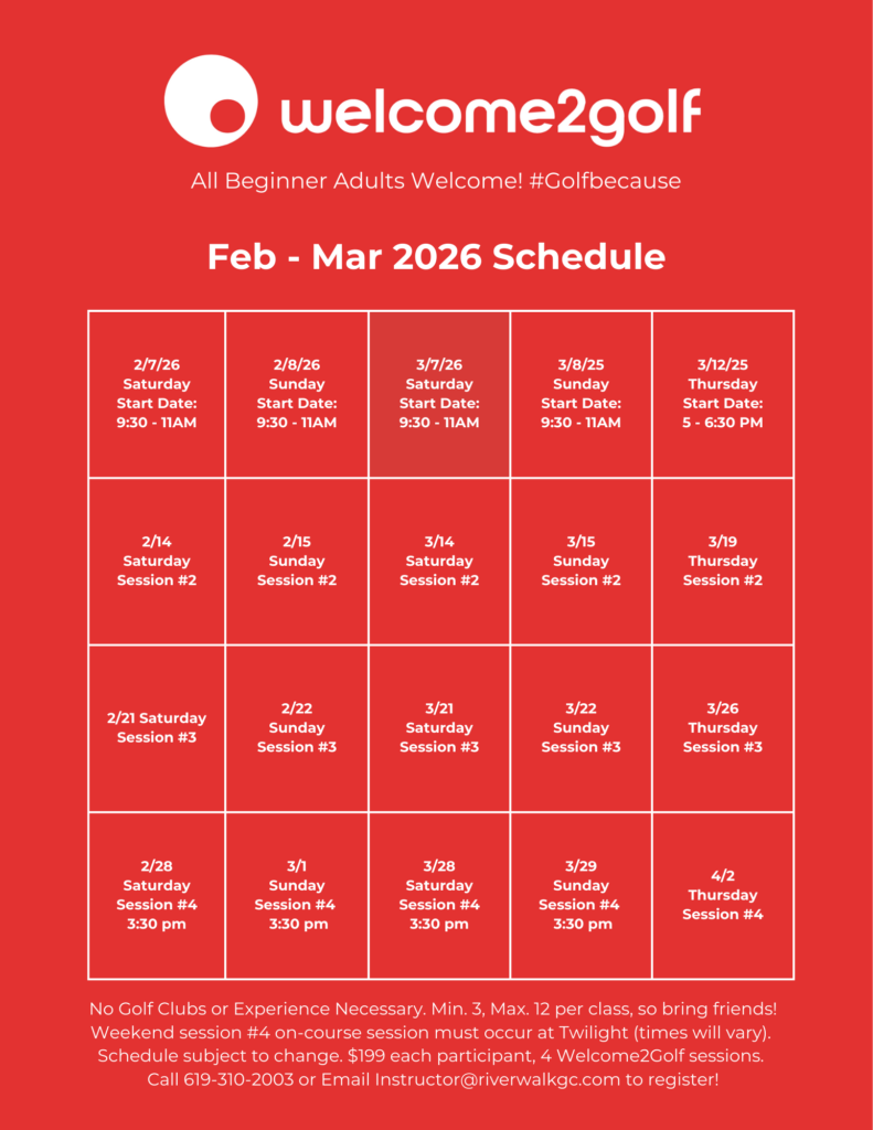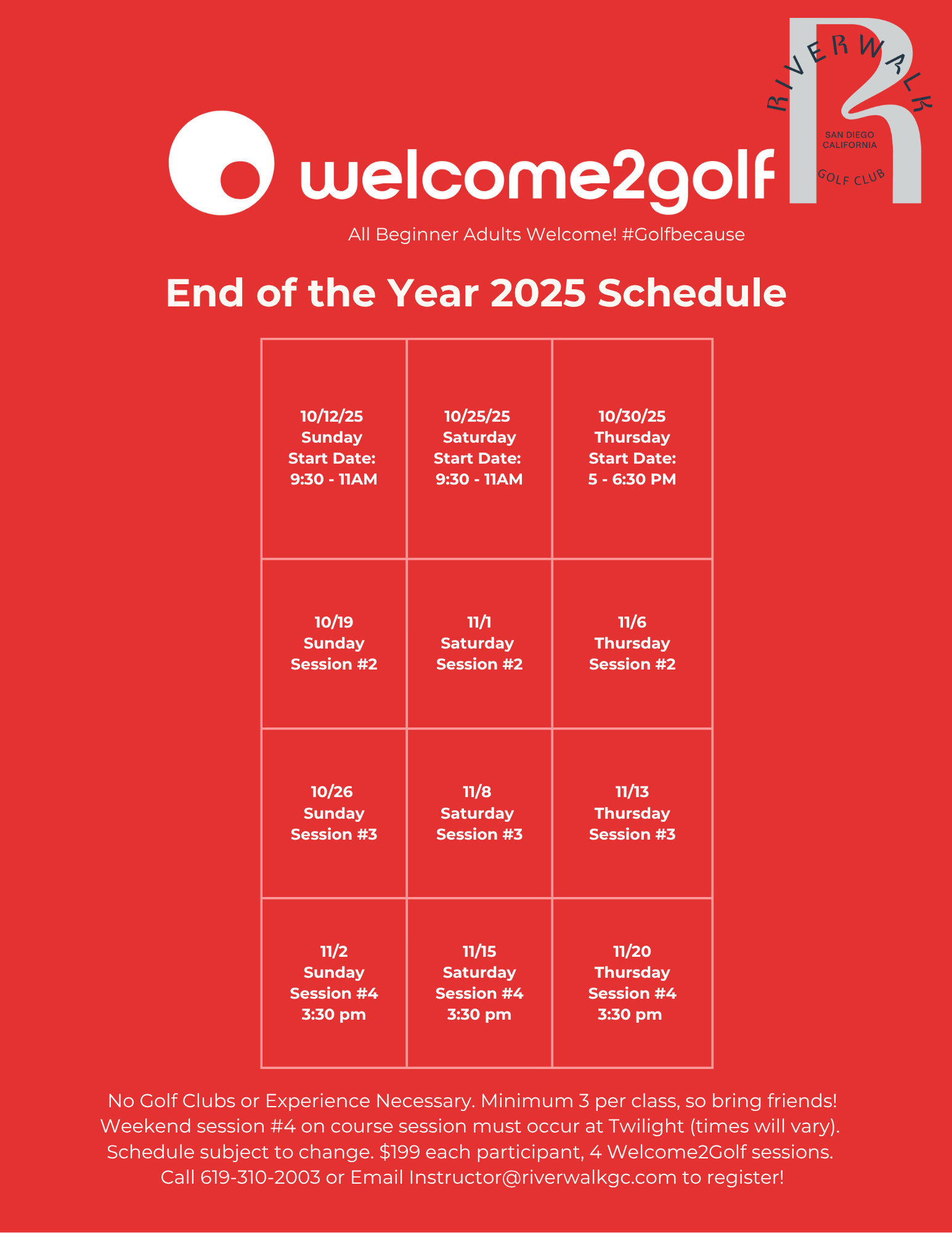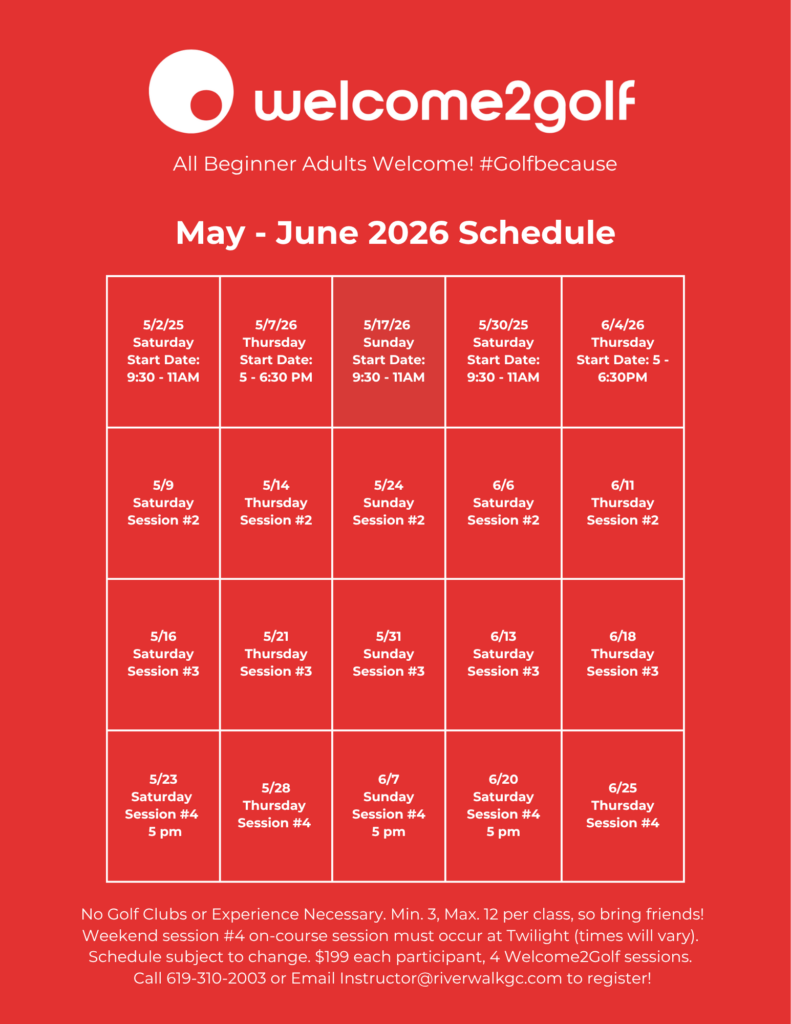 *Classes must be taken on four consecutive dates and times. On-course session (4th lesson) only offered during twilight hours at golf course discretion. No refunds for missed sessions. Missed classes can be made up in a corresponding Welcome2Golf class or in a FLEX class. Rescheduling must be done minimum 24 hrs in advance of session.*